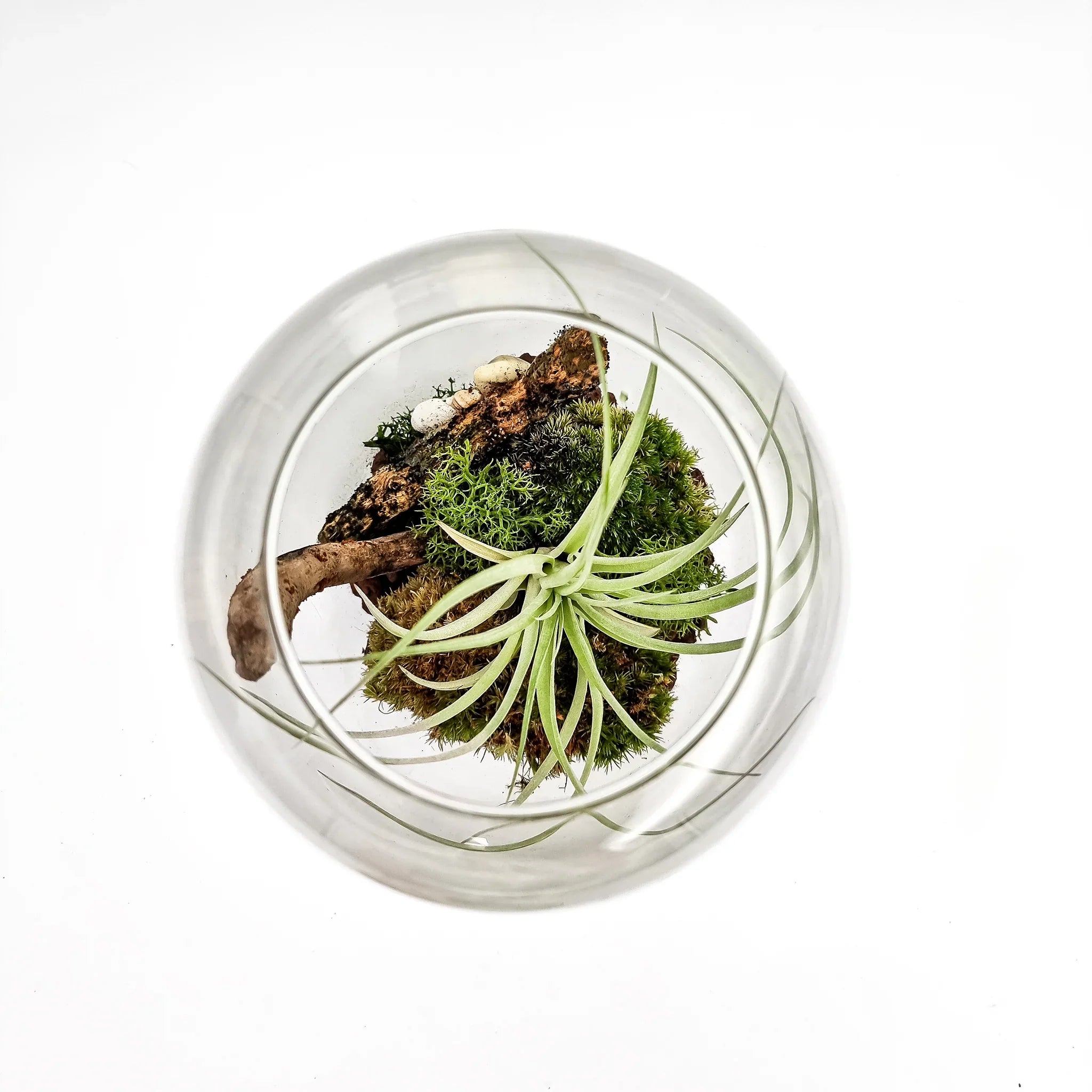 Vista superiore Desert Pearl terrarium aperto che mostra la composizione interna con Tillandsia e substrato naturale
