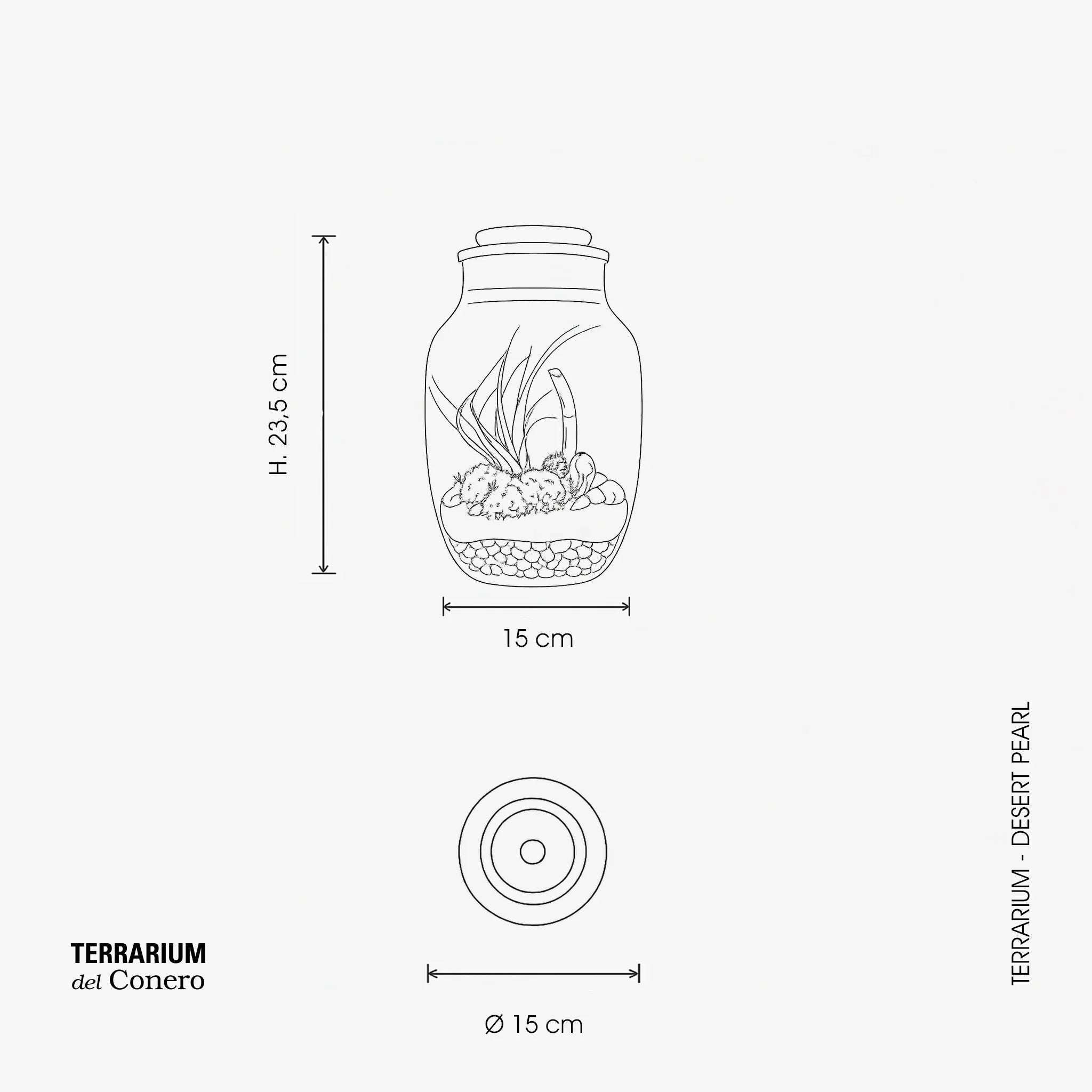 Desert Pearl è una raffinata giara in vetro con tappo coordinato, pensata per custodire l’essenza della natura in forma pura e minimalista. Al suo interno, un’affascinante Tillandsia Straminea  si adagia su un substrato accuratamente composto da lapillo vulcanico di diverse granulometrie e muschio.