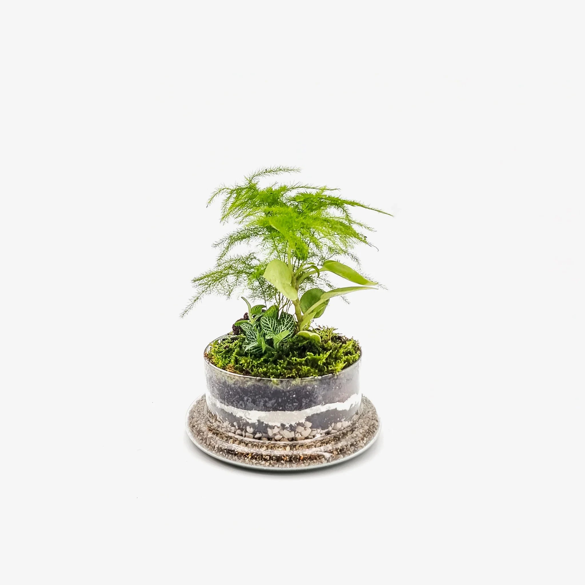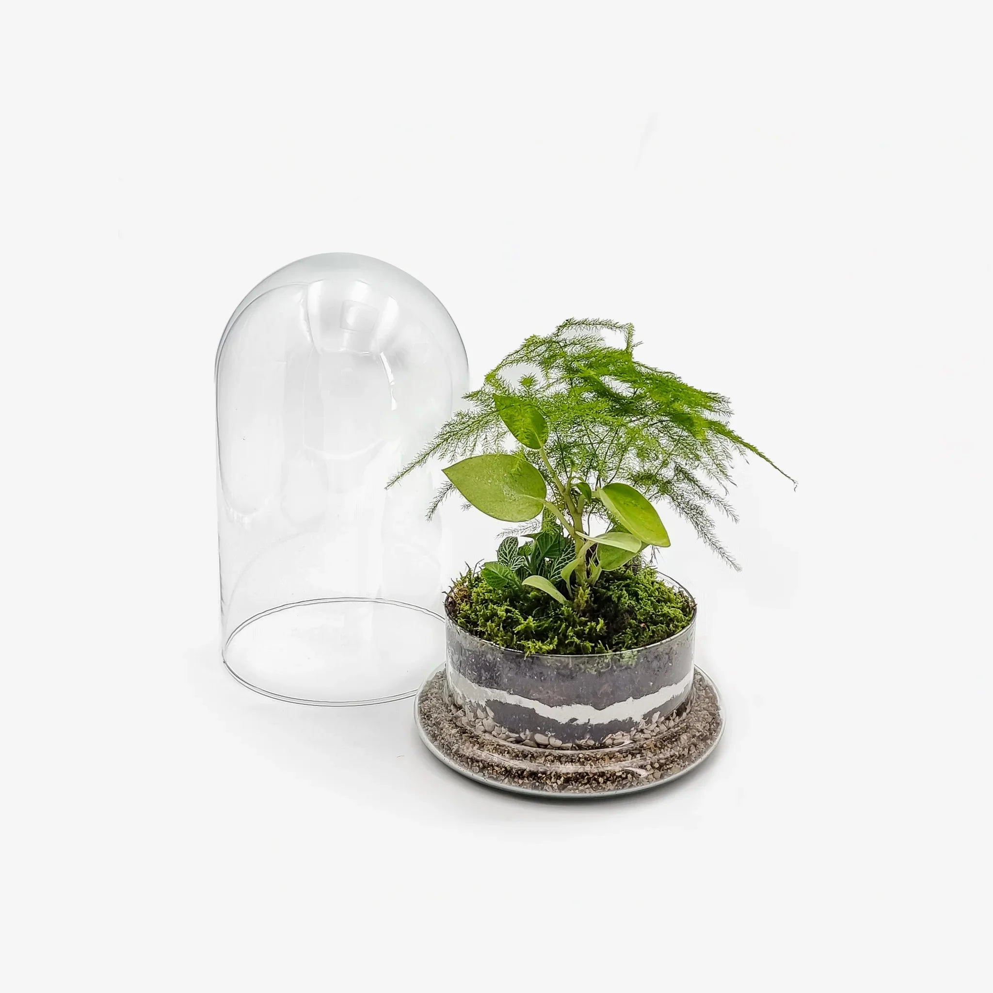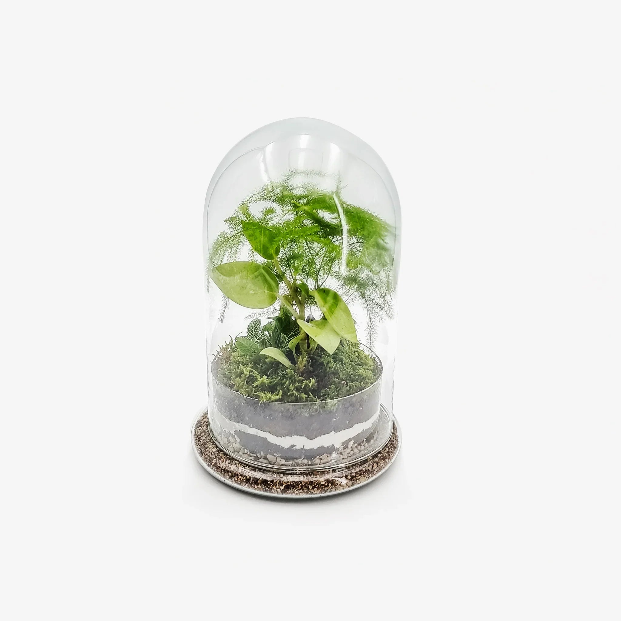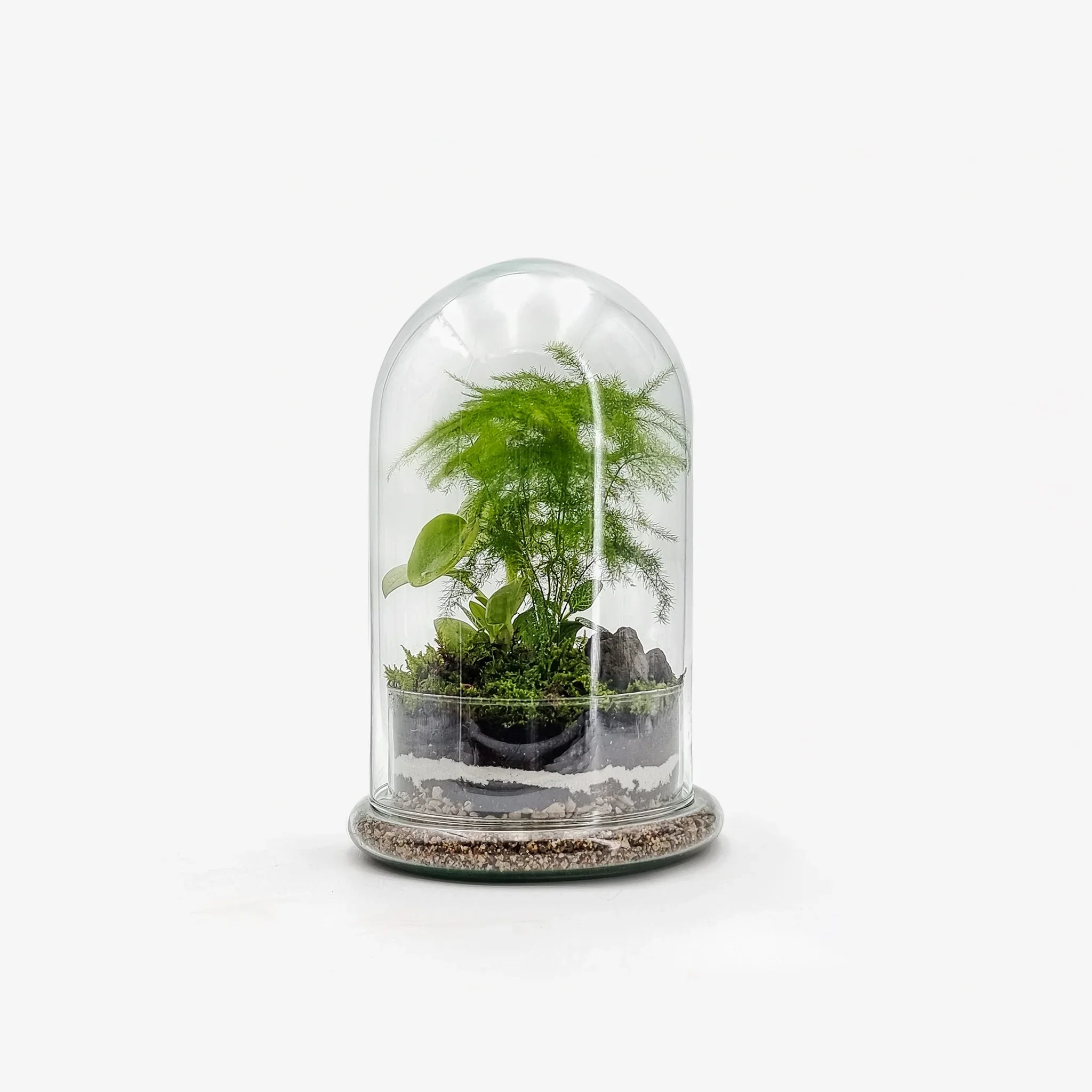 Il nostro Terrarium chiuso Bell Small con vaso a campana combina l’eleganza del design essenziale con un micro-ecosistema naturale. Al suo interno troviamo una pianta di Philodendron Scadens, un Asparagus Setaceus e una Fittonia White, accuratamente disposte per ricreare un ambiente equatoriale umido.
