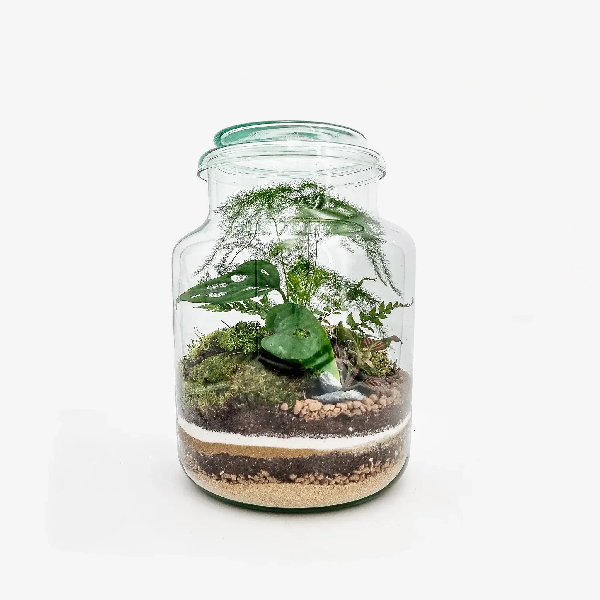 Il nostro Terrarium con vaso chiuso Monstera Pot ricrea un ecosistema dal clima equatoriale umido; al suo interno possiamo trovare una pianta di Monstera, delle Fittonie, un pianta di Asparagus Setaceus, e della Felce.