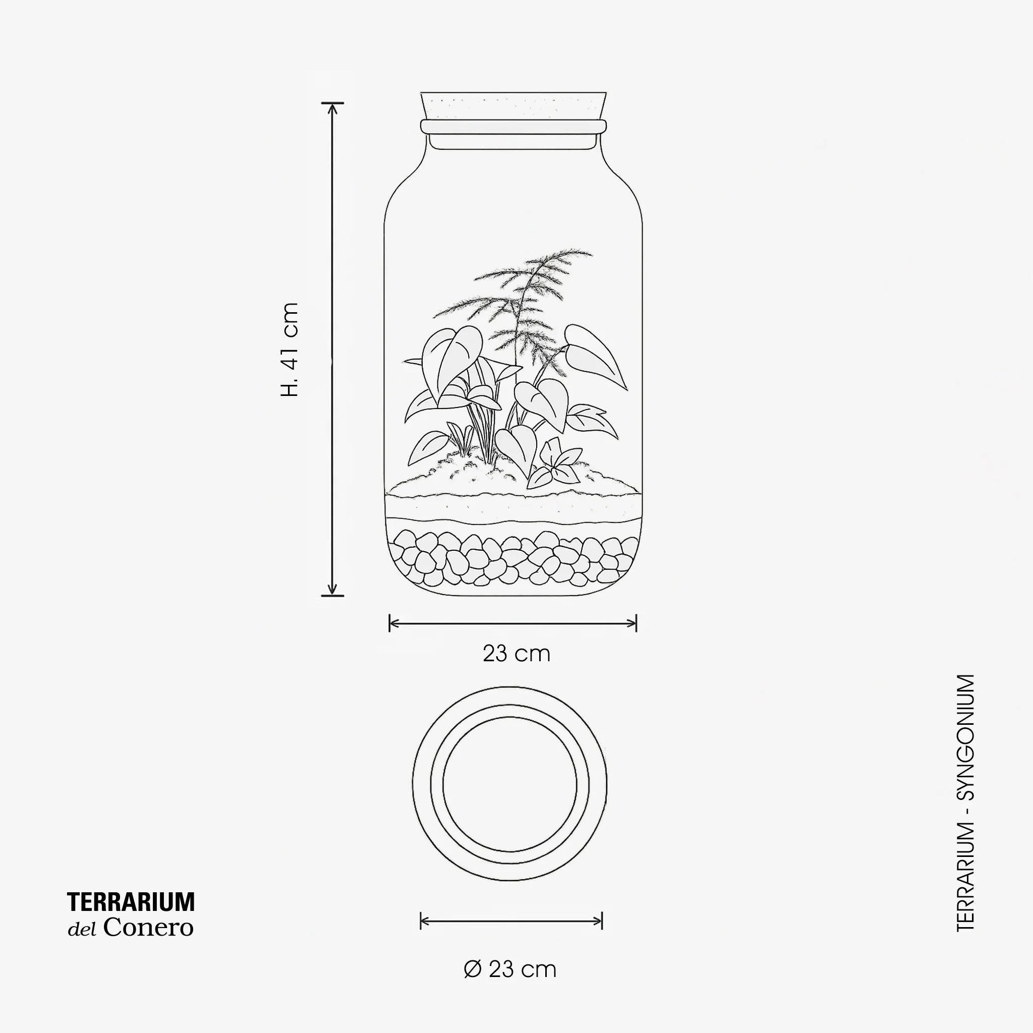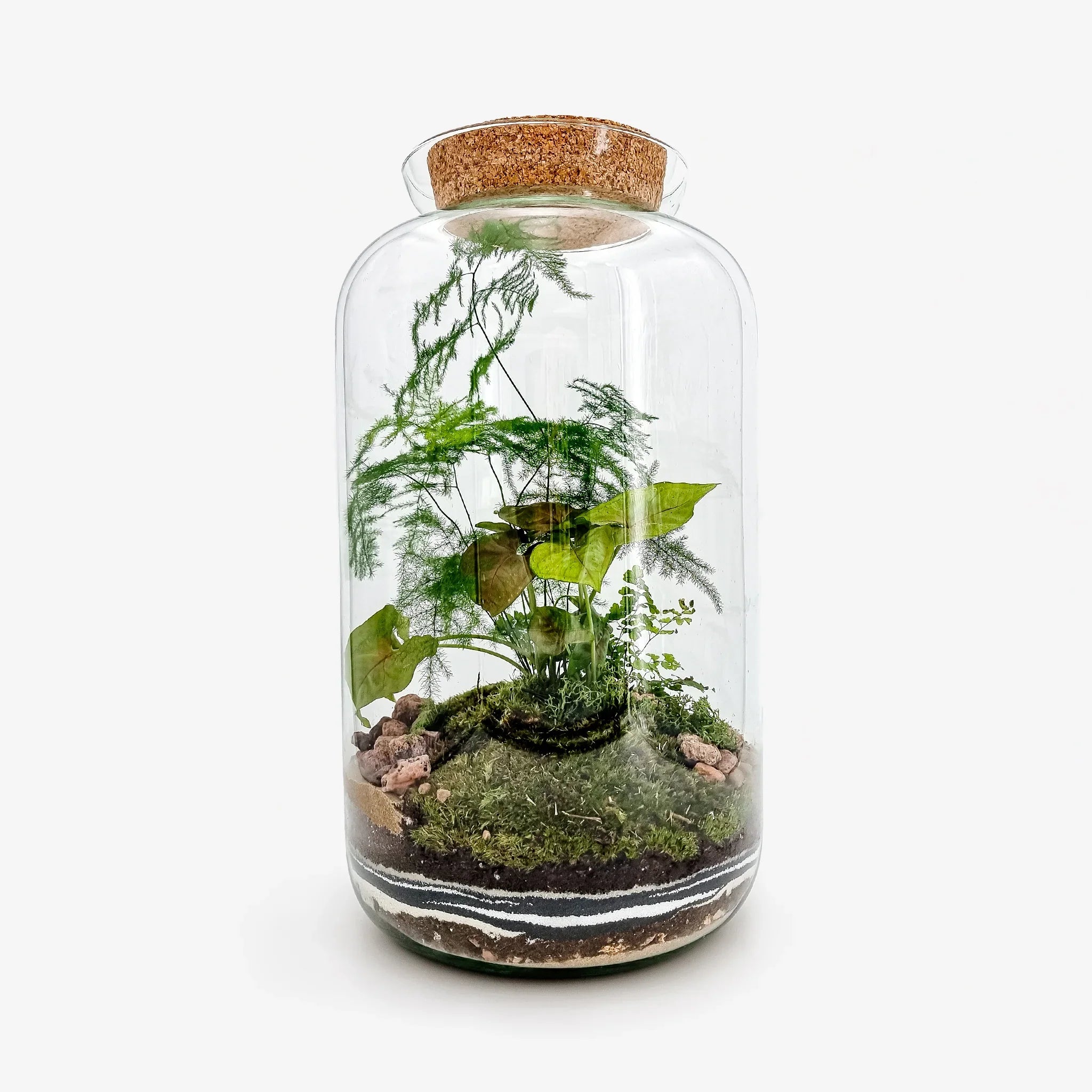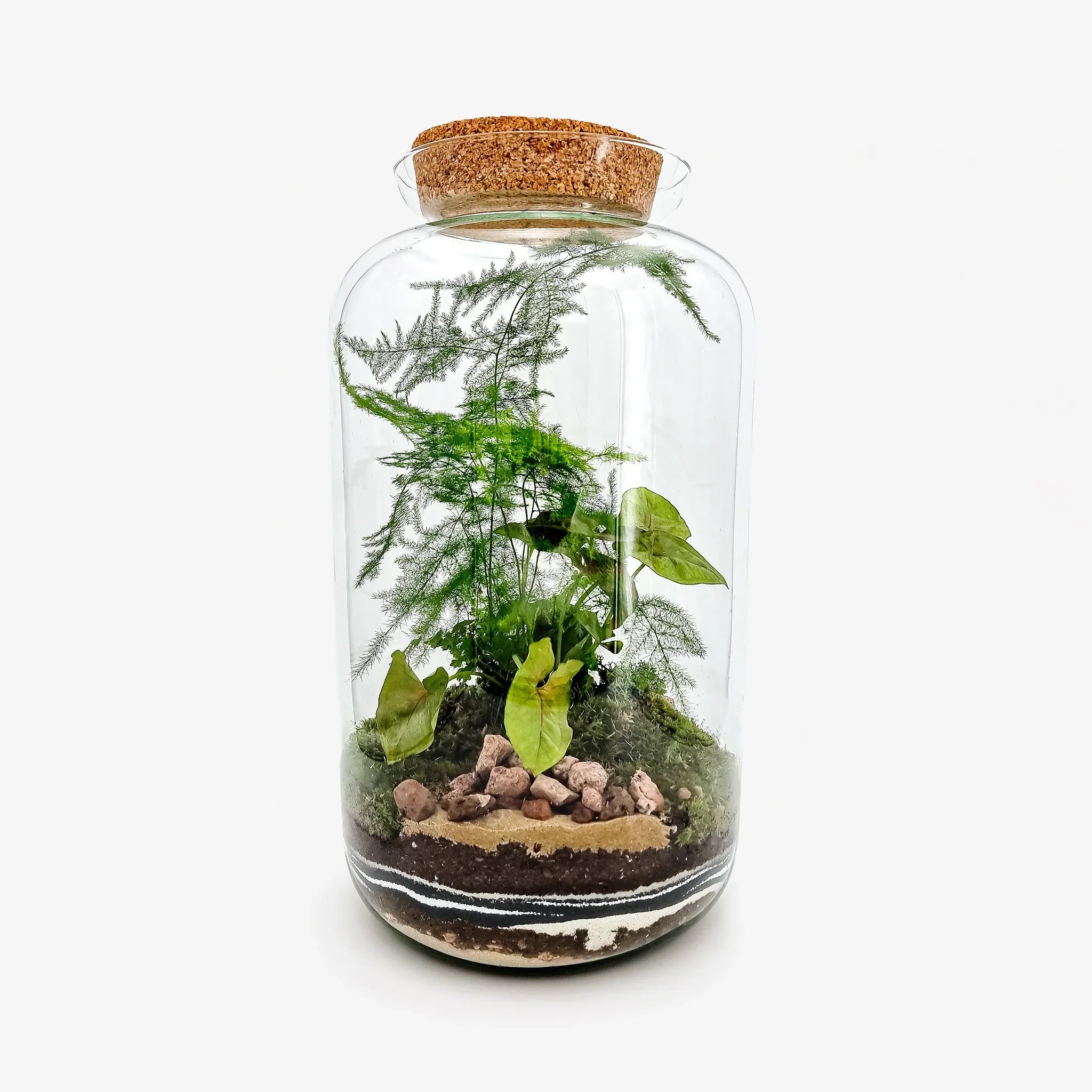 Il nostro Terrarium chiuso Syngonium ricrea un ecosistema dal clima tropicale umido. Al suo interno possiamo trovare una pianta di Syngonium Berry, una pianta di Asparagus Setaceus ed una Felce.