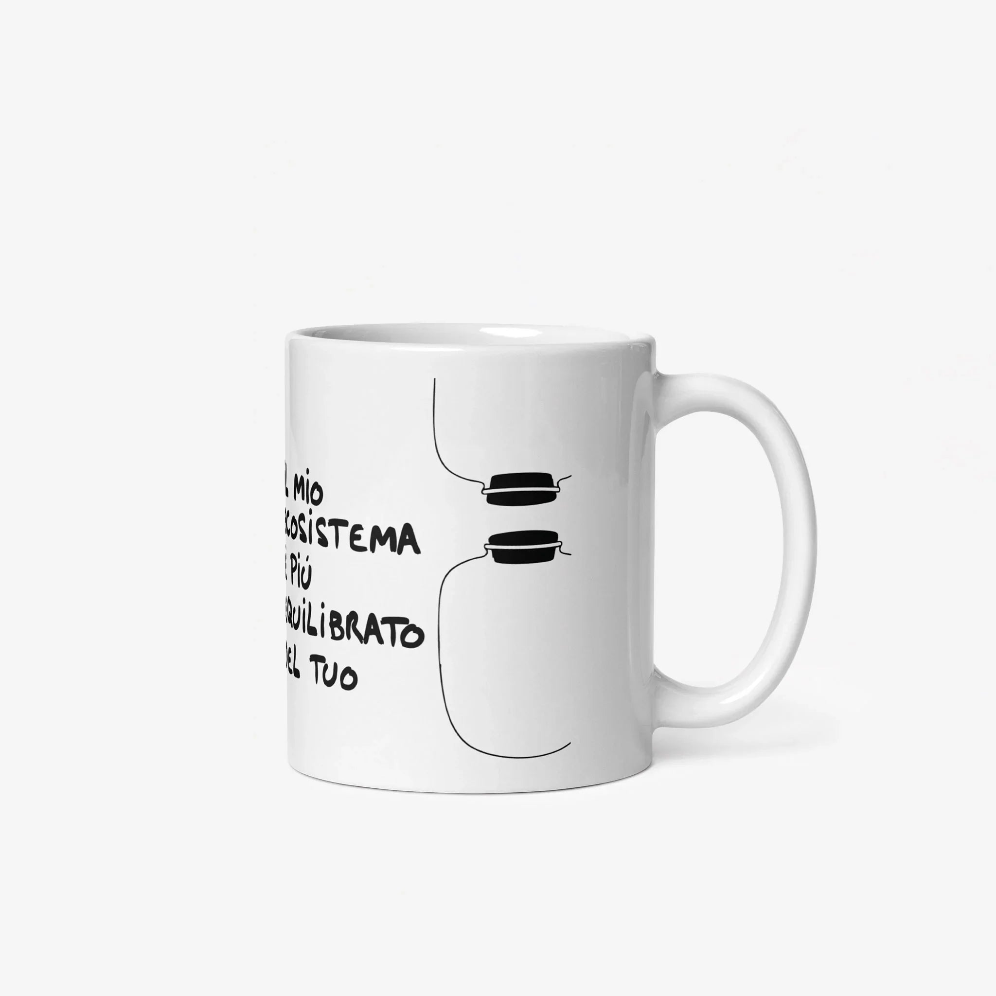 Linee semplici, superfici lucide, stampa precisa. La tazza bianca con la grafica Il mio ecosistema è più equilibrato del tuo porta un filo di design (e di verità) sulla scrivania. Ceramica resistente, facile da usare e da lavare: lavastoviglie e microonde approvati. Un oggetto quotidiano, con un equilibrio migliore del solito.