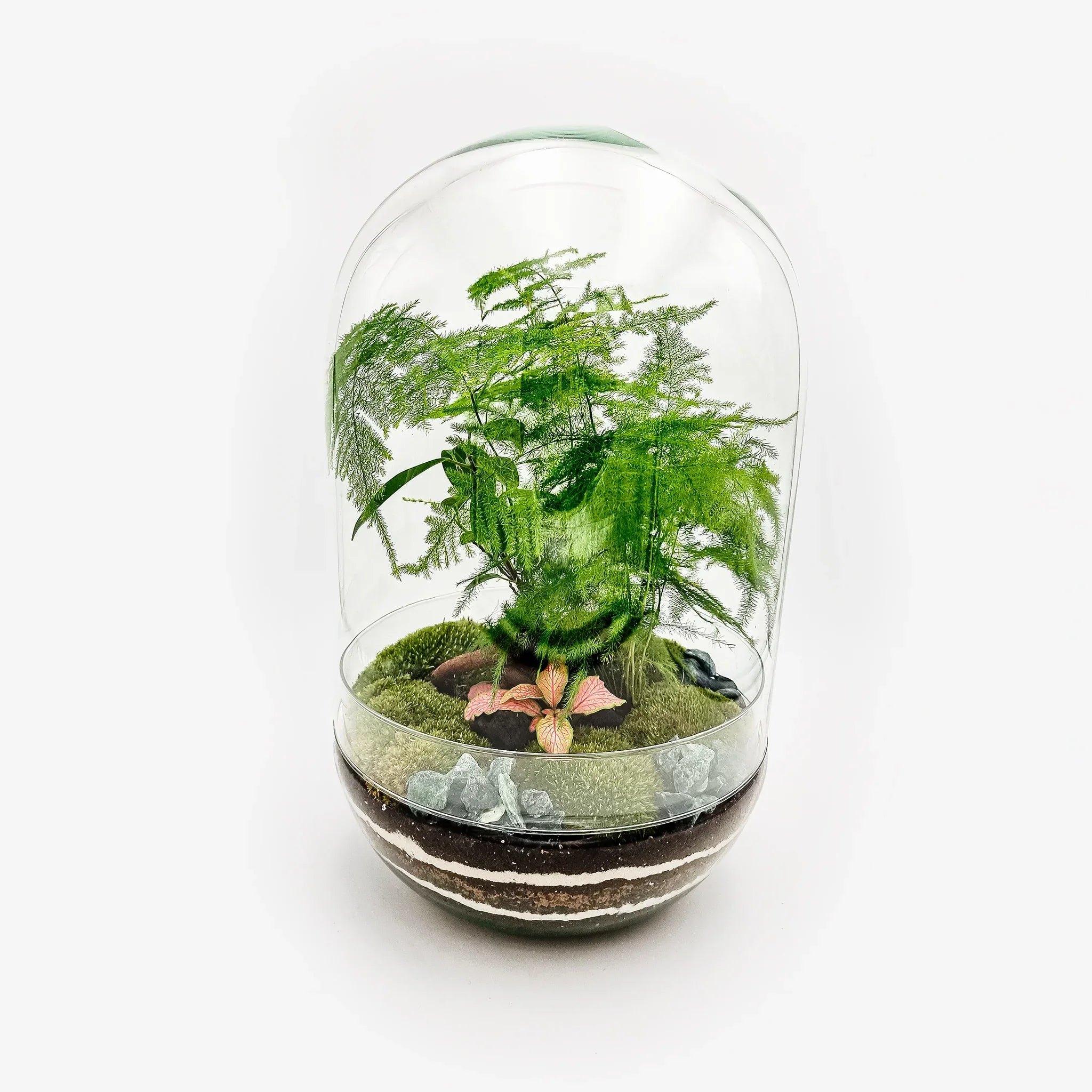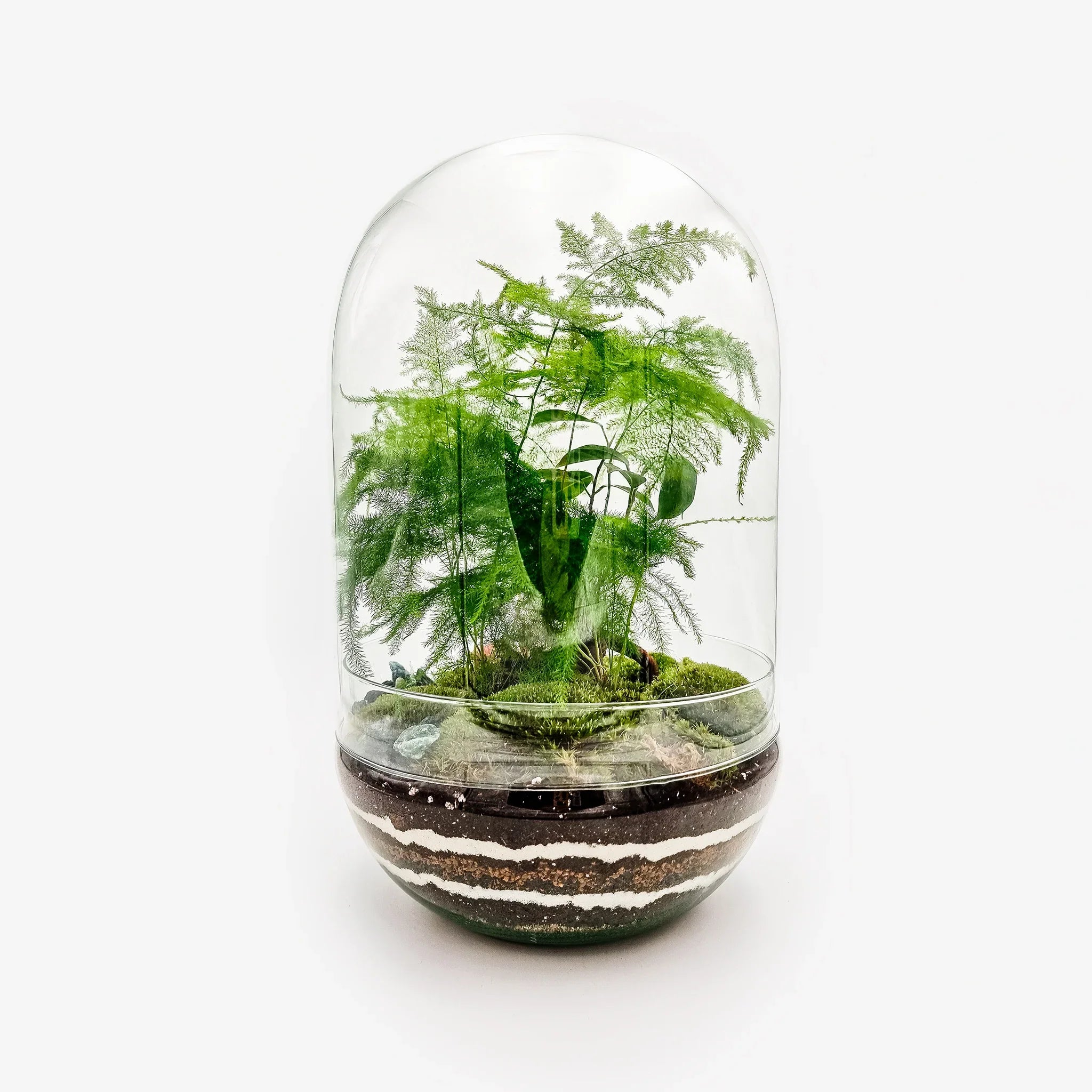 Il terrarium “Capsule”, è un universo verde racchiuso in una capsula in vetro. Al suo interno è presente un bonsai di Ficus Ginseng che si erge tra le delicate foglie della Fittonia e l’eterea leggerezza dell’Asparagus Setaceus.